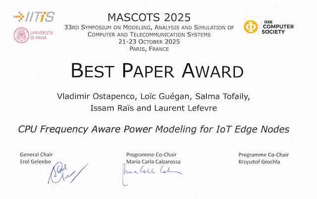 - Vladimir Ostapenco, Loïc Guégan, Salma Tofaily, Issam Raïs and Laurent Lefevre. "CPU Frequency Aware Power Modeling for IoT Edge Nodes", MASCOT2025: 33rd International Symposium on the Modeling, Analysis, and Simulation of Computer and Telecommunication System, Paris, France, October 21-23, 2025 -