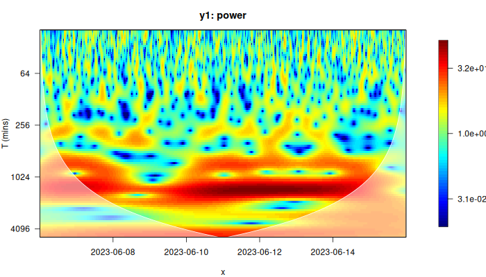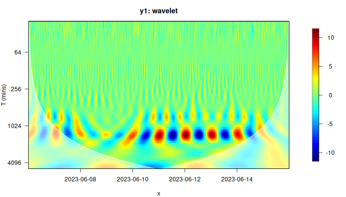 Ici, on peut lire le graphique de cette manière: il y a des variations particulièrement importantes dans le signal à la période 1440 min = 24h sur l'ensemble de la période sauf les 8 et 9 juin (qui s'avèrent être un samedi-dimanche): cela se voyait déjà sur le signal brut. Il y a aussi des variations à une échelle de 720 minutes (12h), et des variations (plus irrégulières peut-être à une échelle entre 240 et 480 minutes (entre 4 et 8h).