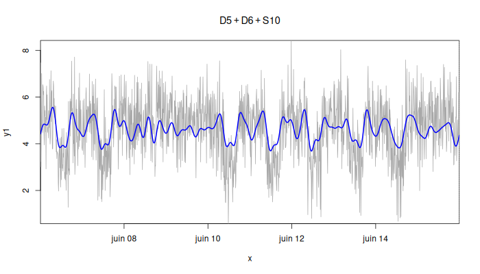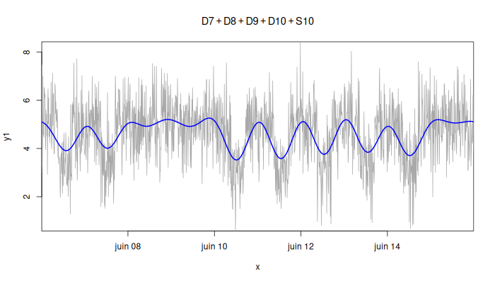 La figure suivante montre le signal "débruité" pour tous les niveaux scalaires inférieures à une périodicité de 24h. On y voit parfaitement le rythme quotidien des humeurs de mon chat.